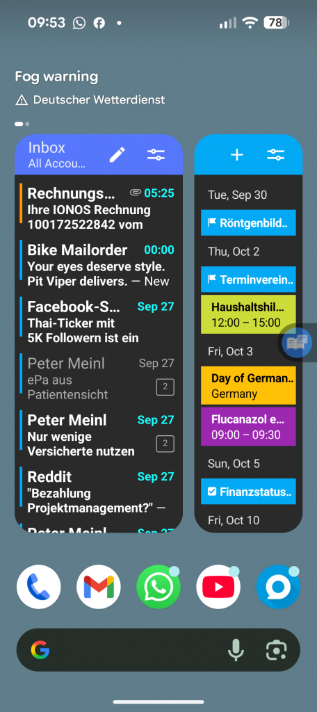 Meine Startseite zeigt die Widgets von Nine für E-Mail und Kalender. Die weiteren Seiten gruppieren die App-Icons zu Banking und Finanzen, zum Reisen, Werkzeug-Apps, Gesundheit, Wetter und Luftqualität, ein vollseitiges Widget zu MS To Do und eines, welches meinen Kalender und den meiner Eltern gemeinsam anzeigt. Der Screenshot zeigt rechts am Rand das floating Icon für den Android Reading Mode.