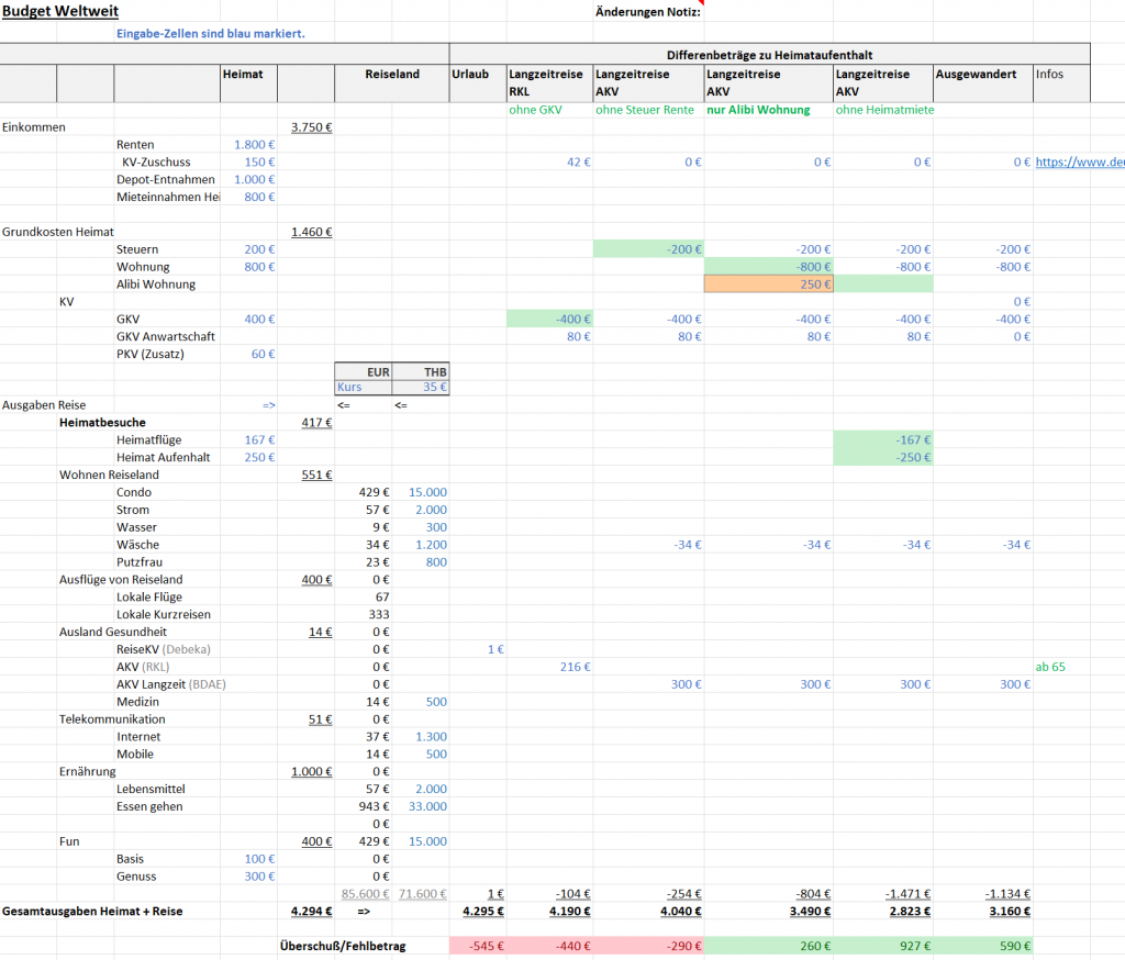 Das ist im Arbeitsblatt abgebildet, indem z.B. in Spalte „Langzeitreise RKL“ der GKV-Beitrag von 400€ abgezogen wird und der GKV-Zuschuss der DRV von 150€ auf auf 30€ reduziert wird, aber dafür 80€ für GKV-Anwartschaft und 216€ für eine HanseMerkur RKL Auslandsreise-KV (ab 65J) berücksichtigt werden.