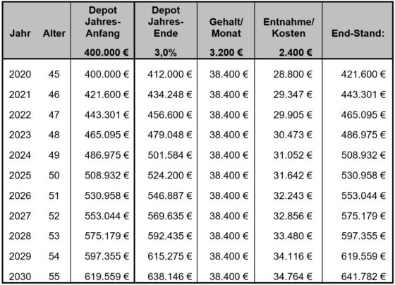 Die Eingabe der Restlebenserwartung bewirkt die Markierung der Zeile mit dem erwarteten Lebensende „Habe Fertig“. Man sieht aber auch die Entwicklung der Werte in den nachfolgenden Jahren.