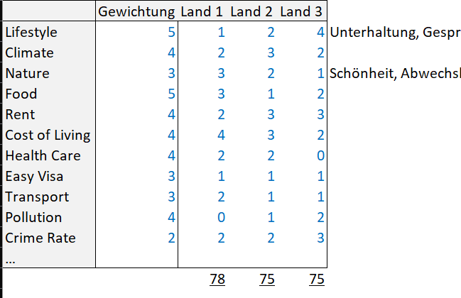 Zum Vergleichen von Reisezielen kann eine gewichtete Ziel/Lösung-Matrix (in Excel) hilfreich sein: