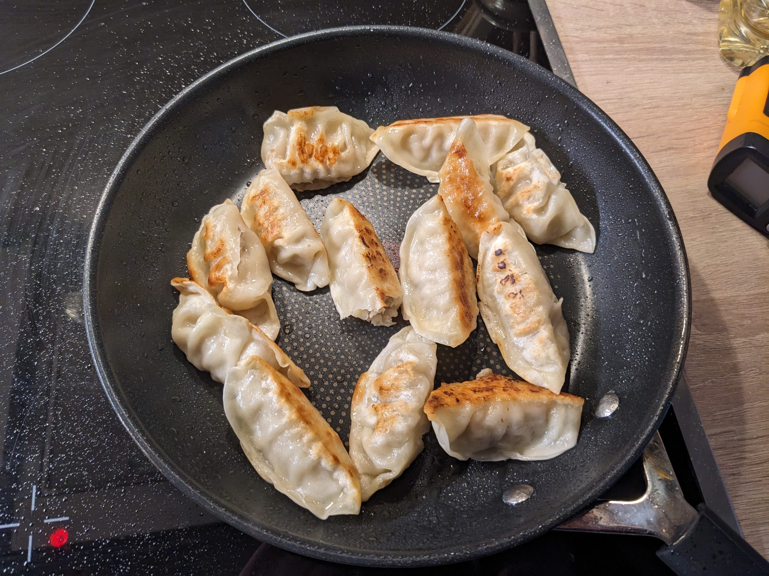 - Die tiefgefrorenen Gyoza 2 Min in Öl anbraten