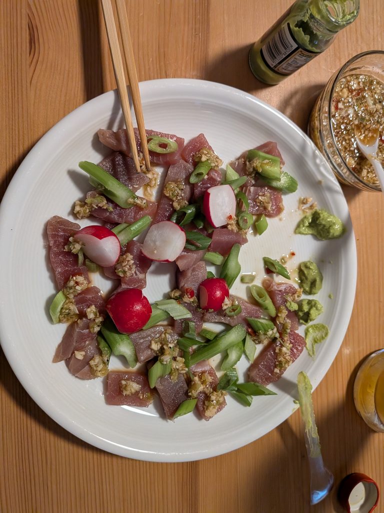 Ich kaufe Tartar nicht beim Metzger, sondern schneide mir lieber ein Steak klein – ich mag etwas grobere Konsistenz. Dazu eine scharfe Thai-Sauce.