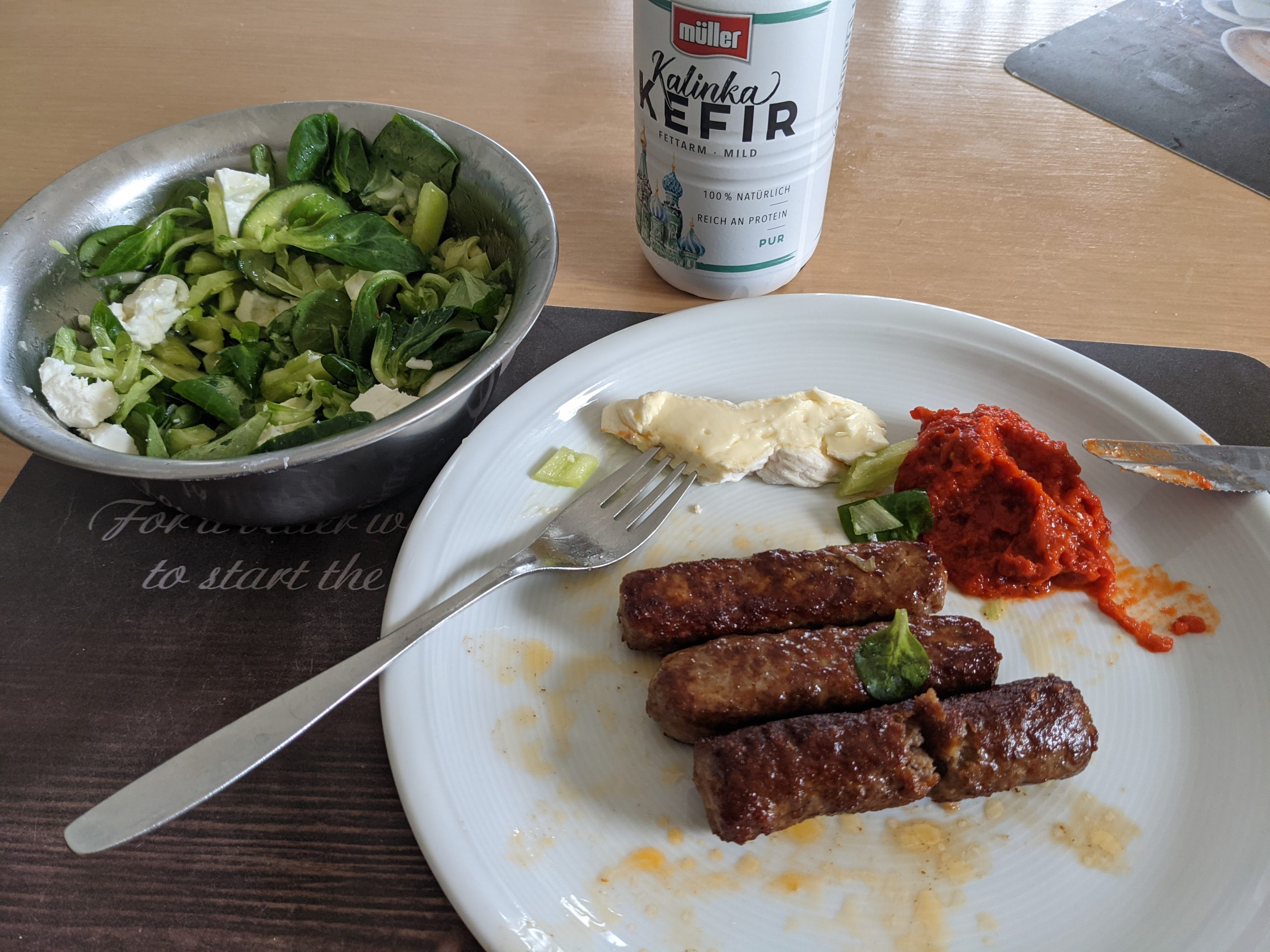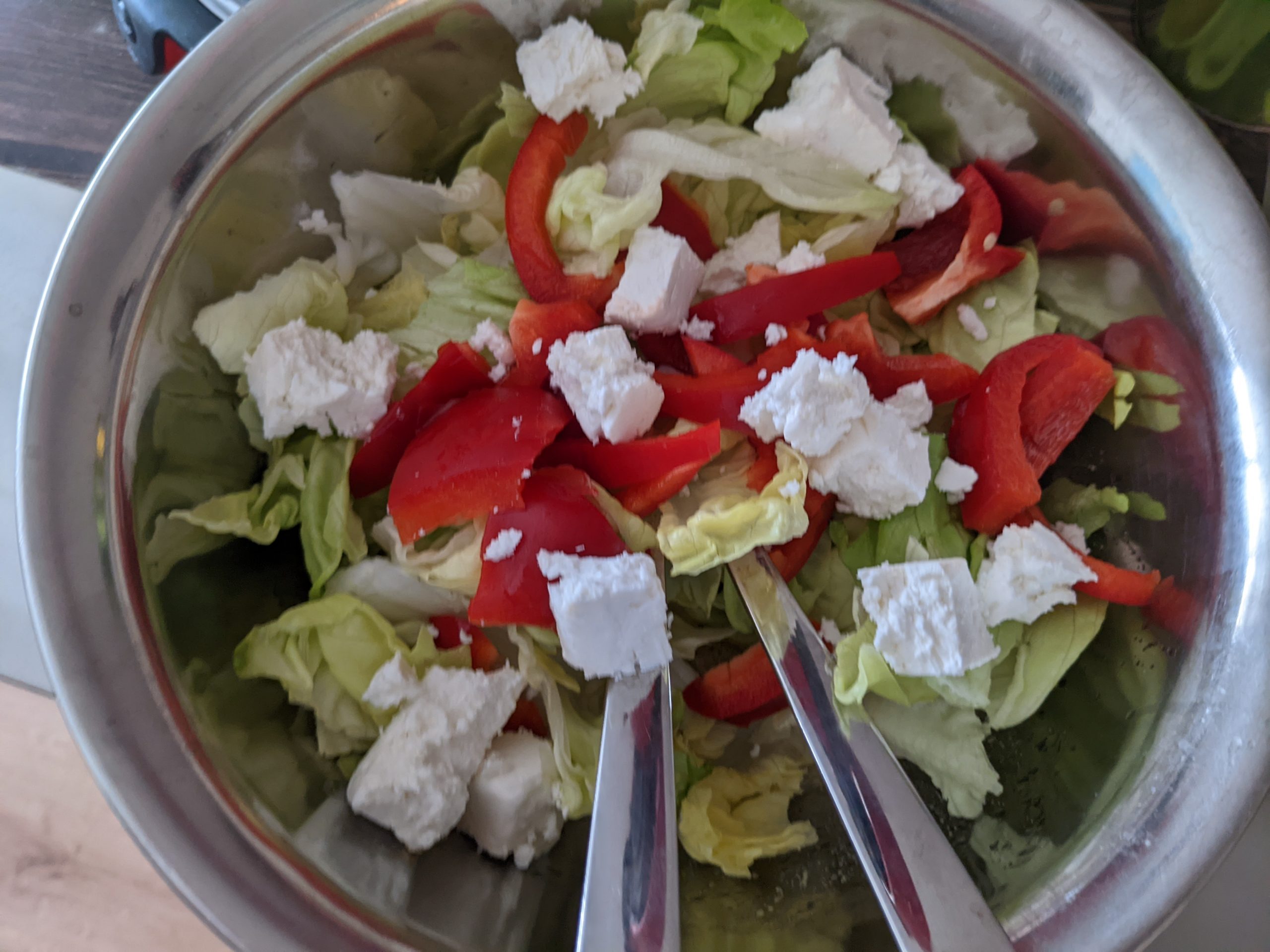 Meine standard Salatsosse: 1 grosser Löffel Gurkenwasser (von den guten Spreewald Gewürzgurken, schmeckt runder als Essig), 3 grosse Löffel gutes Olivenöl, Senf und Meerrettich aus der Tube, Spritzer Sojasosse, Salz, Pfeffer und kleingehackte Zwiebeln.