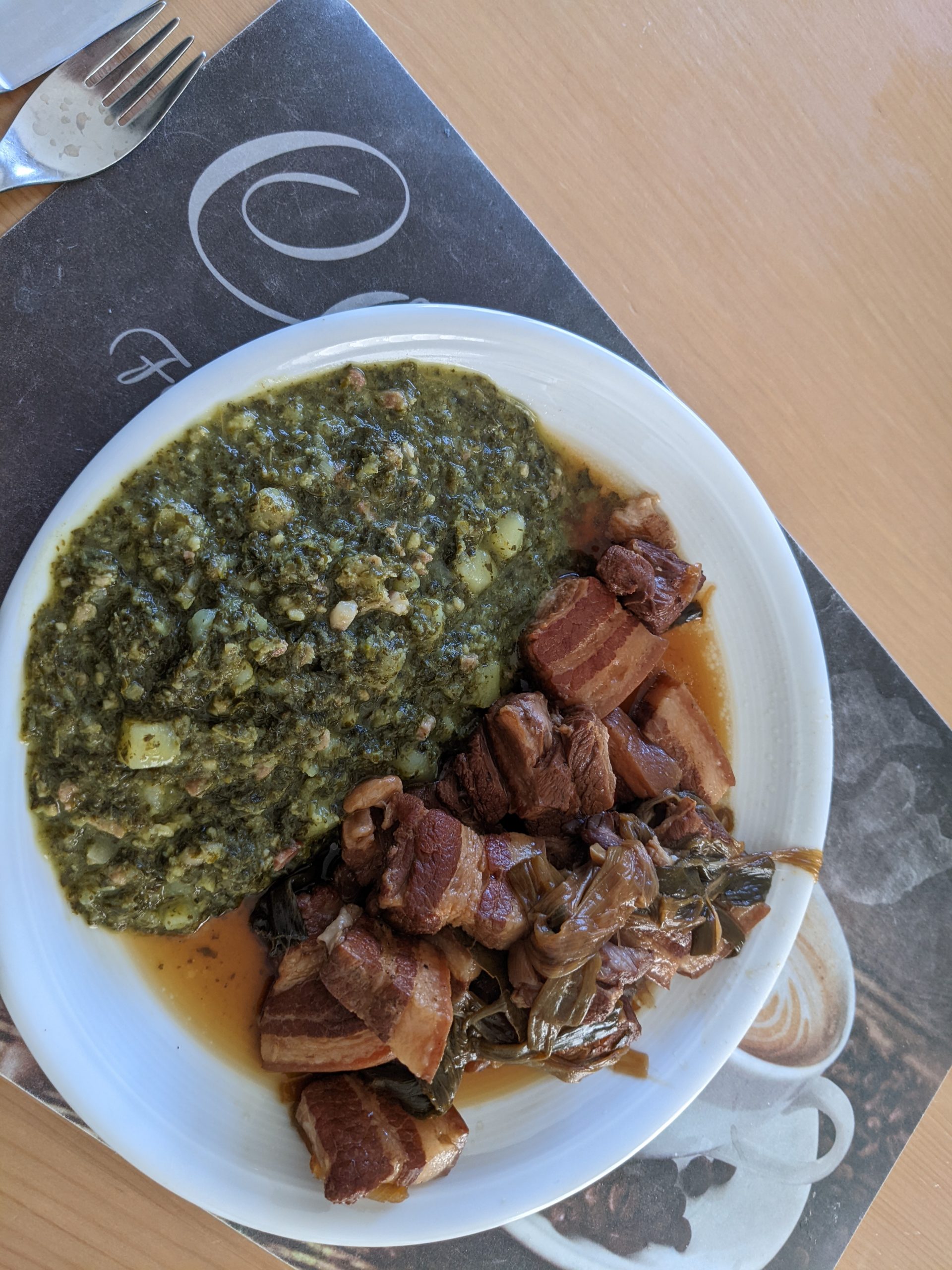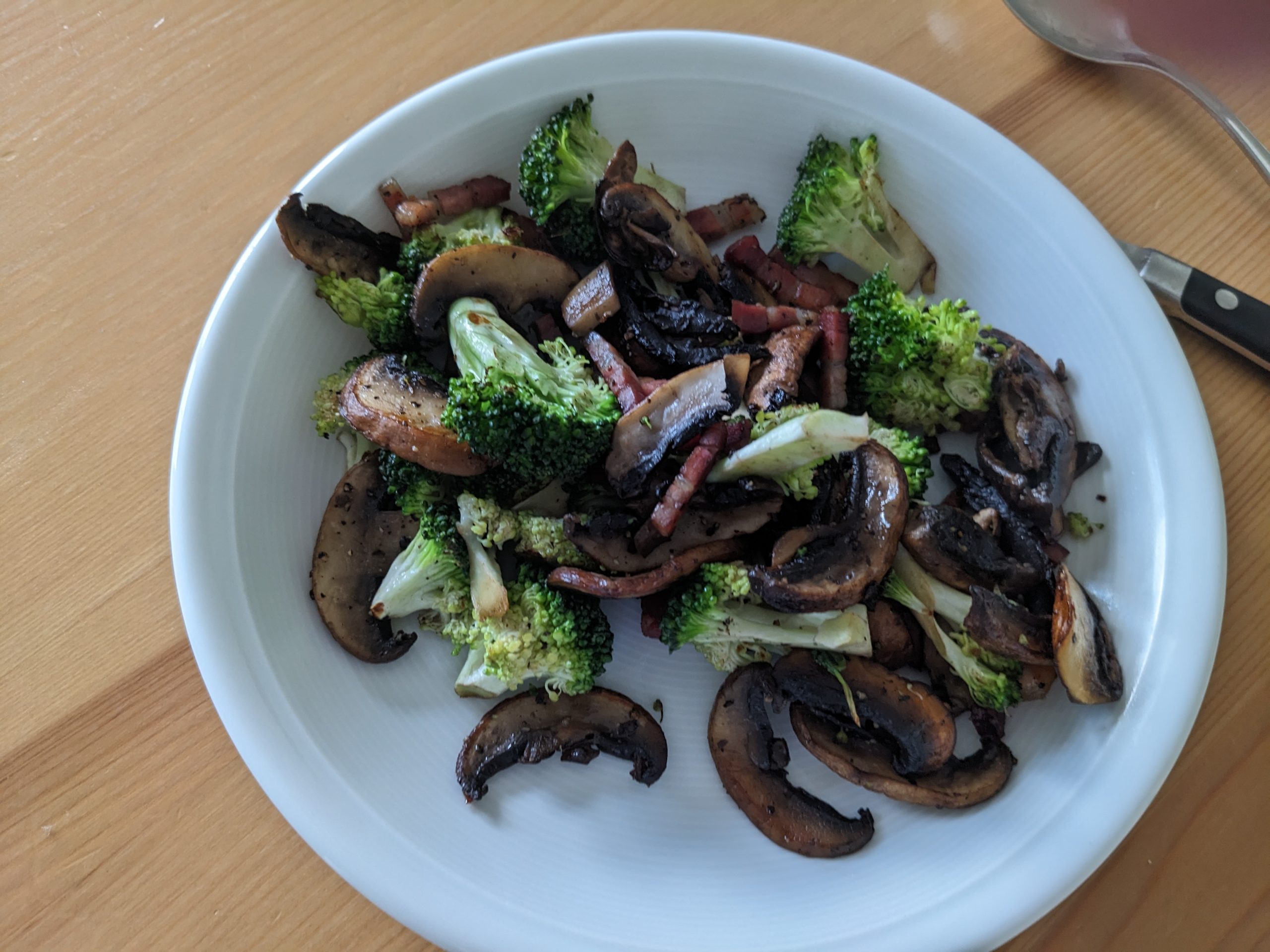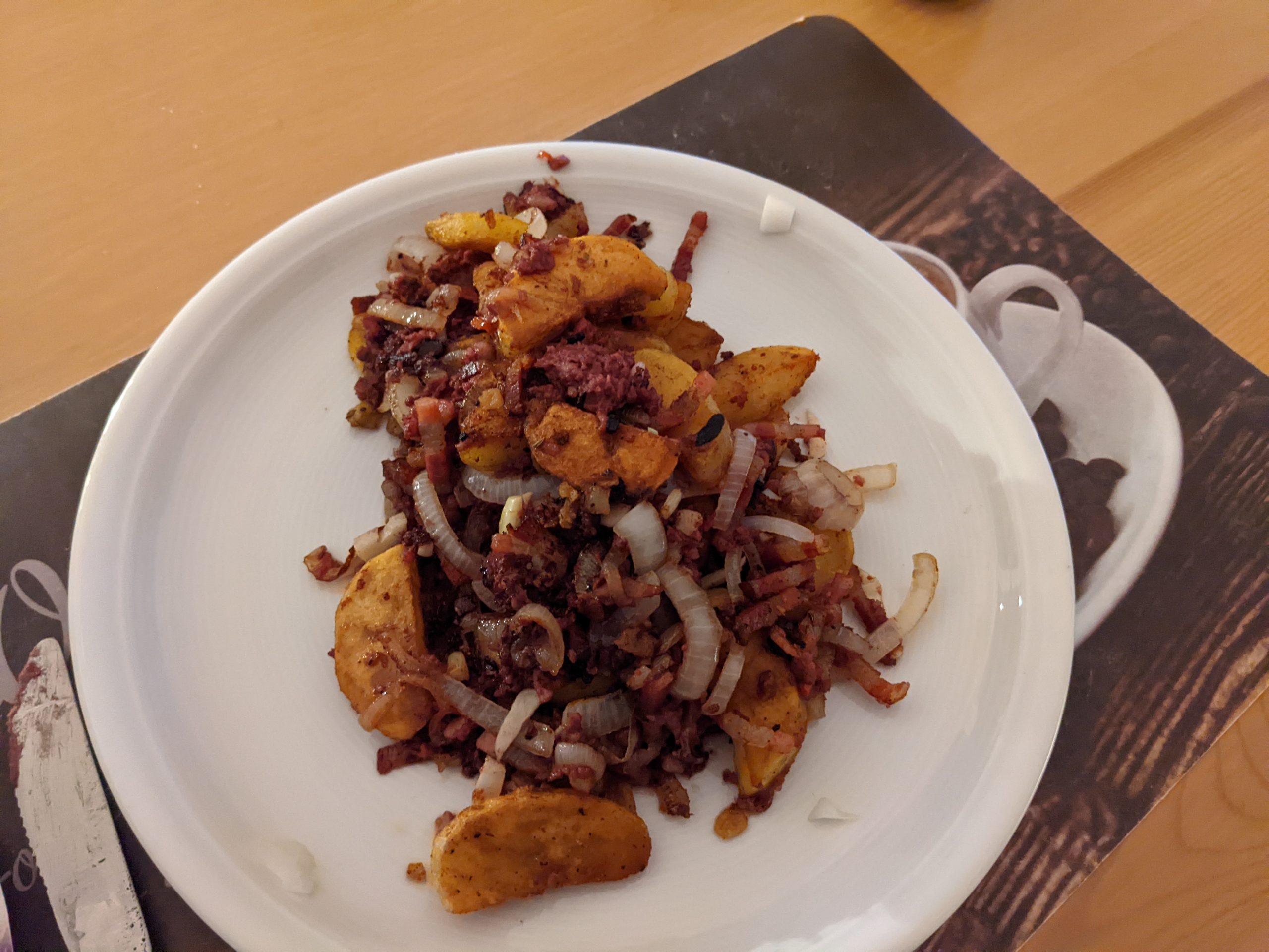 Bei allen Zutaten kommt es nicht so genau auf die Menge an. Schmeckt halt jedes Mal ein bisschen anders. Schmeckt besonders gut mit Kartoffelstampf (gekochte Kartoffeln grob stampfen – nicht so fein wie ein Püree, es sollen noch Bröckchen da sein). Mit ordentlich, leicht gebräunter Butter und etwas Milch verfeinern. Mit viel grobem Pfeffer und ein bisschen Muskatnuss würzen.