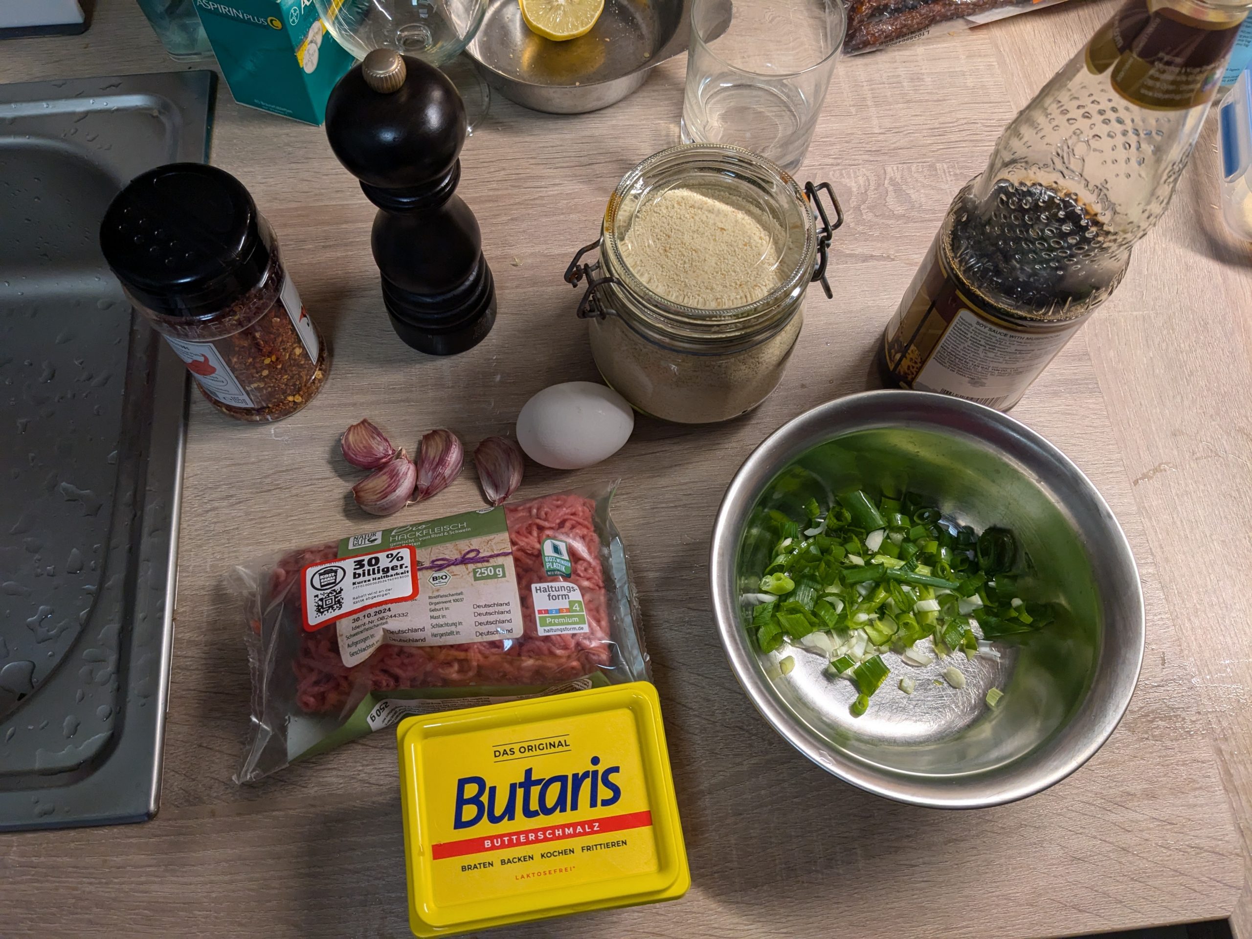 Ein Schälchen mit meiner Lieblings-Sojasoße Healthy Boy Mushroom dazu und vielleicht eines mit einer schnell selbstgemachten Thai prik nam pla Soße oder mit der sogar im Penny erhältlichen scharfen Sriracha Chilli Soße oder Yamaza Gyoza Sauces Umami Spicy aus dem Aisa-Laden.