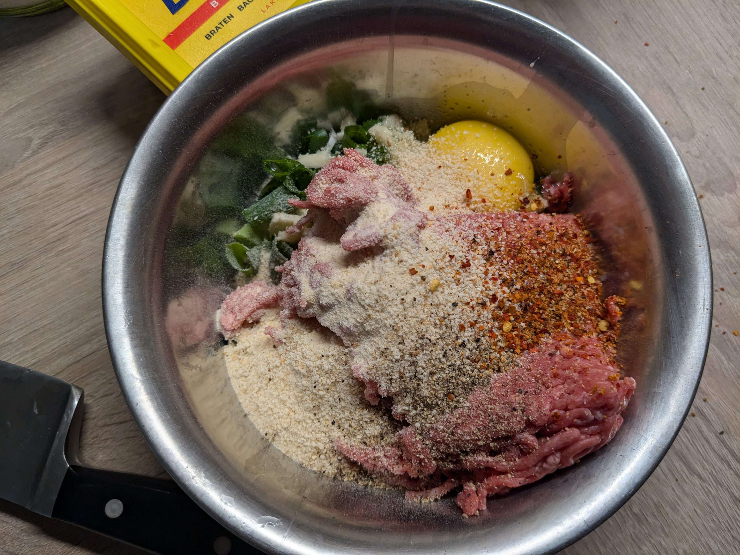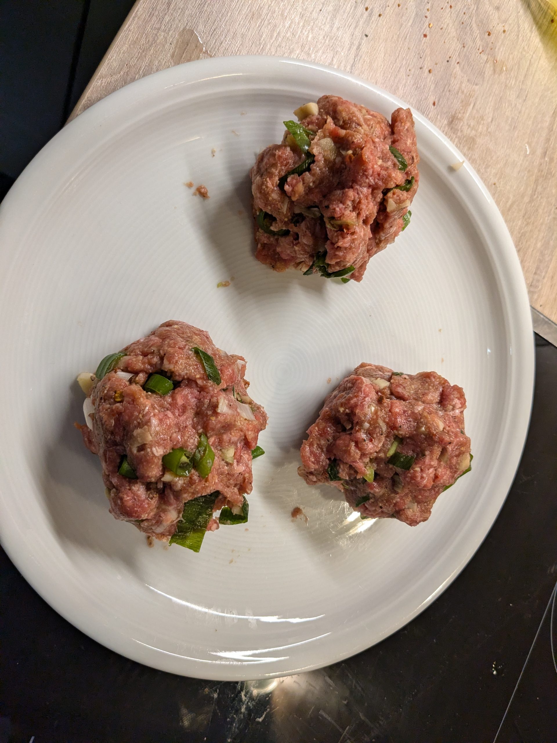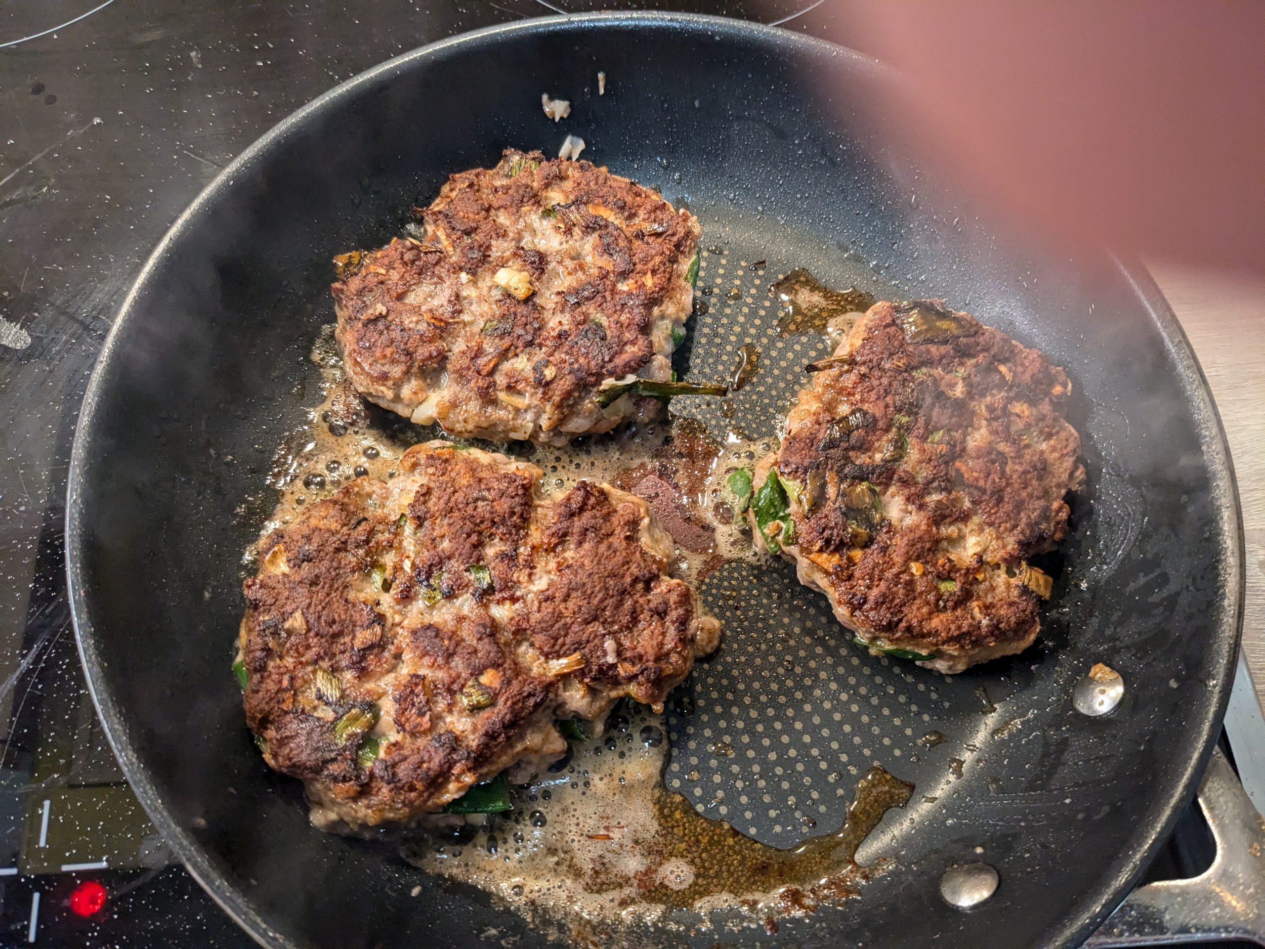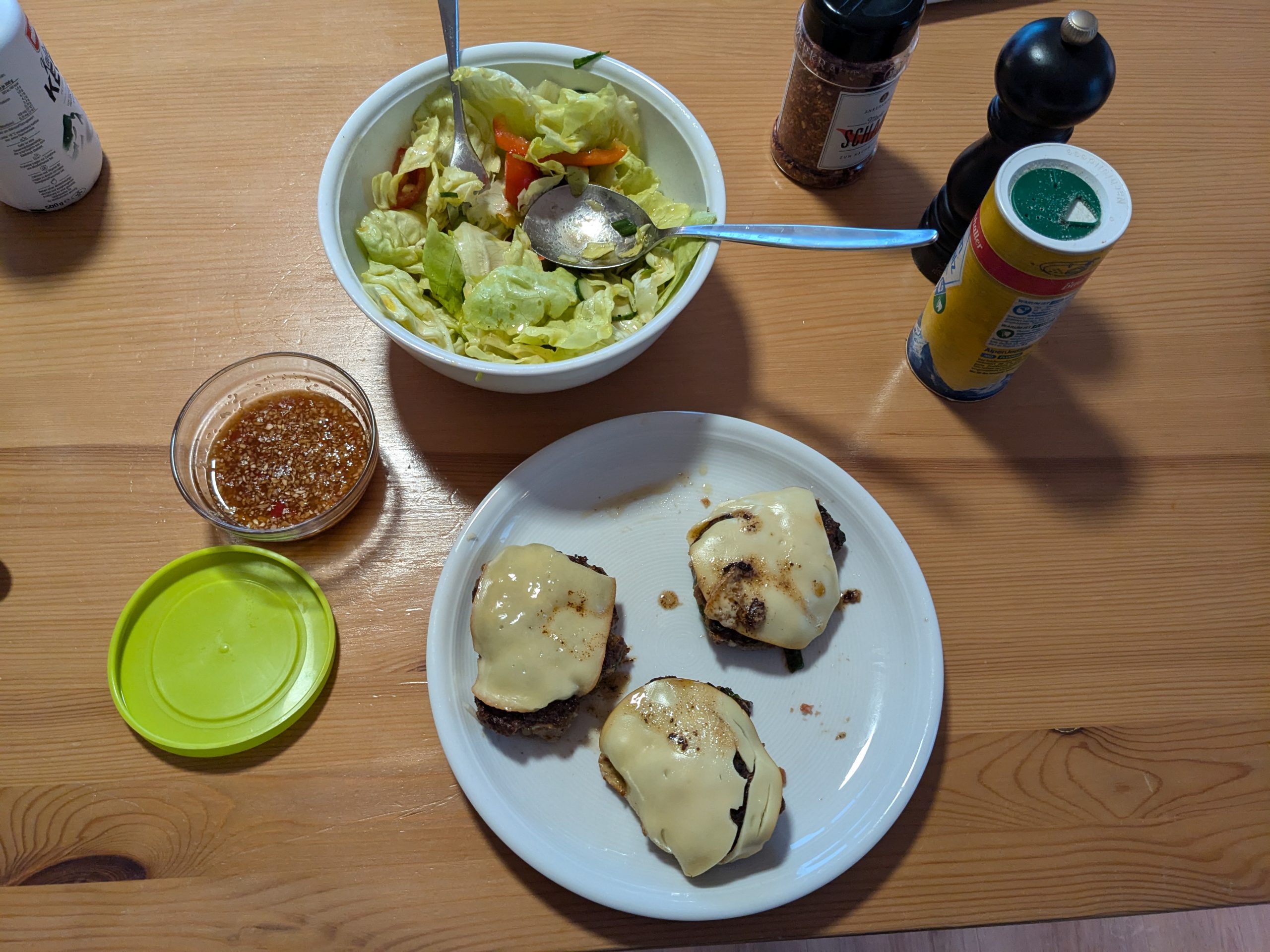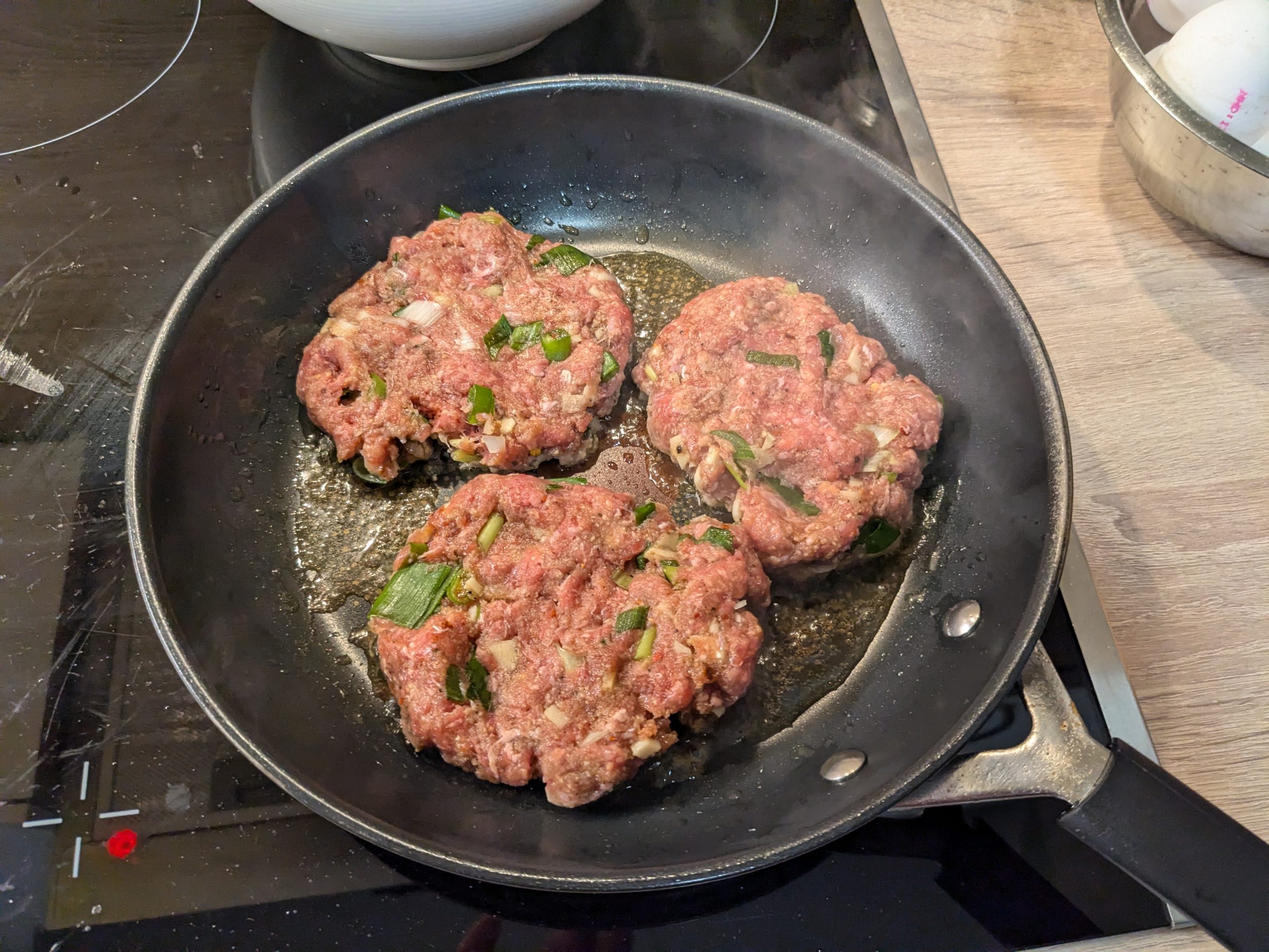 Ich nehme ca. 250g Hack (Rinder oder gemischt), manchmal schneide ich mir auch einfach ein günstiges Steak klein. Manchmal mische ich etwas Frühlingslauch rein, manchmal angedünstete Zwiebeln, vielleicht mit etwas Speck. Etwas Semmelbrösel gleichen die Flüssigkeit durch das Ei wieder aus (damit die Frikadellen nicht auseinanderfallen) und machen die Frikadellen locker. Ich würze mit Pfeffer, Salz, Chiliflocken und Sojasoße. Ich drücke die Frikadellen in der Pfanne ziemlich platt, damit ich mehr knusprige Kruste habe. Am Ende lege ich noch ein paar Scheiben Käse drauf und lasse die unter dem Deckel schmelzen.