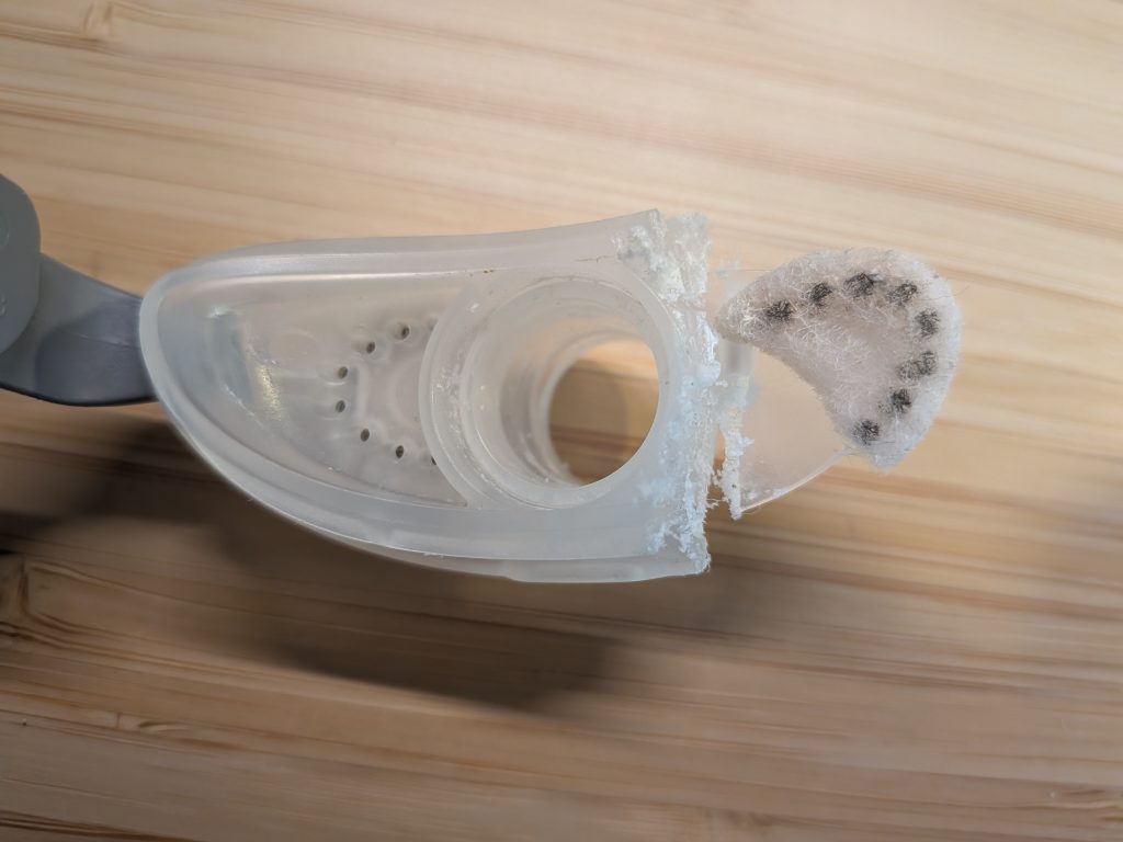 Wenn sie mal Ausströmgeräusche macht, kommt das von Restwasser vom Reinigen. Den Diffusor einfach trocknen zu lassen, verstopft ihn bei hartem Wasser schnell. Das Wasser aus dem Diffusor blasen hilft. Habe mal eine Maske aufgeschnitten, hier sieht man den Schaumstoff, der die Atemgeräusche dämpfen soll: