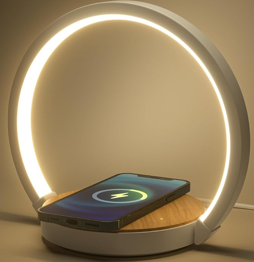 Nachttischlampe (*). Touch dimmbar auf 3 Stufen. Arm neigbar. Handy kabellos laden.